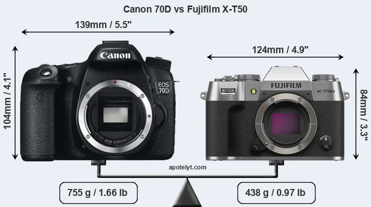 The above size and weight comparisons are to some extent incomplete since they do not consider the interchangeable lenses that both of these cameras require. Both cameras have similarly sized sensors, but DSLRs have a larger flange-to-focal plane distance than mirrorless cameras, which imposes contraints on the optical engineering process and generally leads to bigger and heavier lenses. You can compare the optics available for the two cameras in the Canon EF Lens Catalog (70D) and the Fujinon X Lens Catalog (X-T50). Mirrorless cameras, such as the X-T50, have moreover the advantage that they can use many lenses from other systems via adapters, as they have a relatively short flange to focal plane distance.