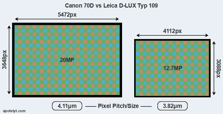 With 20MP, the 70D offers a higher resolution than the D-LUX Typ 109 (12.7MP), but the 70D nevertheless has larger individual pixels (pixel pitch of 4.11μm versus 3.82μm for the D-LUX Typ 109) due to its larger sensor. However, the D-LUX Typ 109 is a somewhat more recent model (by 1 year and 2 months) than the 70D, and its sensor might have benefitted from technological advances during this time that enhance the light gathering capacity of its pixels.