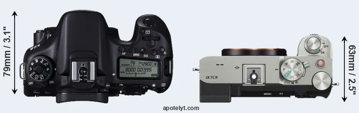The physical size and weight of the Canon 70D and the Sony A7C R are illustrated in the side-by-side display below. The two cameras are presented according to their relative size. Three consecutive views from the front, the top, and the rear side are shown. All width, height and depth dimensions are rounded to the nearest millimeter.