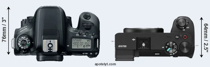 An illustration of the physical size and weight of the Canon 77D and the Sony A6700 is provided in the side-by-side display below. The two cameras are presented according to their relative size. Three successive views from the front, the top, and the rear are shown. All width, height and depth measures are rounded to the nearest millimeter.