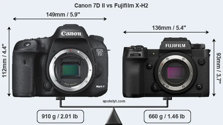 The side-by-side display below illustrates the physical size and weight of the Canon 7D II and the Fujifilm X-H2. The two cameras are presented according to their relative size. Three successive views from the front, the top, and the rear are shown. All width, height and depth dimensions are rounded to the nearest millimeter.