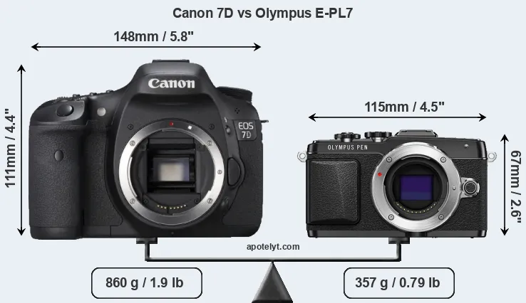 An illustration of the physical size and weight of the Canon 7D and the Olympus E-PL7 is provided in the side-by-side display below. The two cameras are presented according to their relative size. Three successive views from the front, the top, and the rear are shown. All width, height and depth dimensions are rounded to the nearest millimeter.