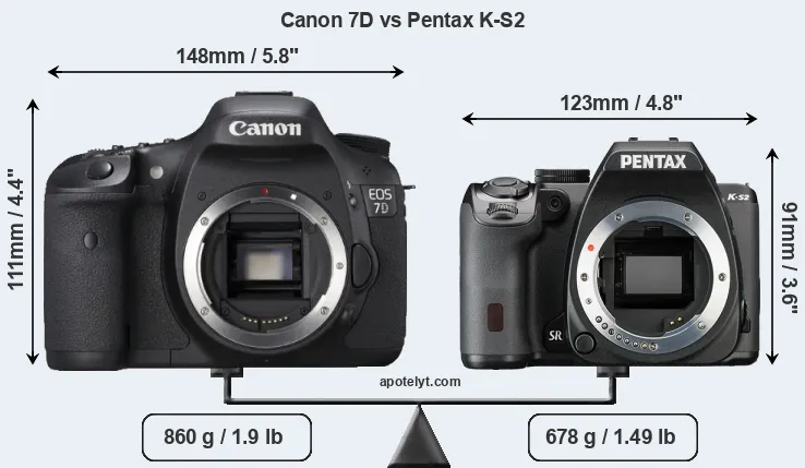 An illustration of the physical size and weight of the Canon 7D and the Pentax K-S2 is provided in the side-by-side display below. The two cameras are presented according to their relative size. Three successive views from the front, the top, and the rear are shown. All width, height and depth measures are rounded to the nearest millimeter.