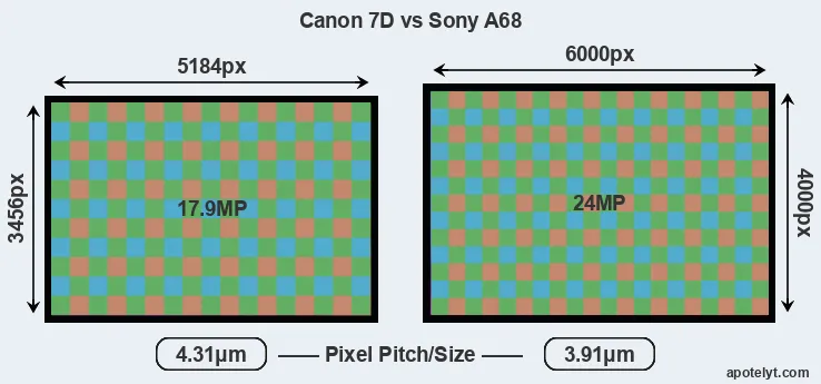 With 24MP, the A68 offers a higher resolution than the 7D (17.9MP), but the A68 has smaller individual pixels (pixel pitch of 3.91μm versus 4.31μm for the 7D). Yet, the A68 is a much more recent model (by 6 years and 2 months) than the 7D, and its sensor will have benefitted from technological advances during this time that enhance the light gathering capacity of its pixel-units.