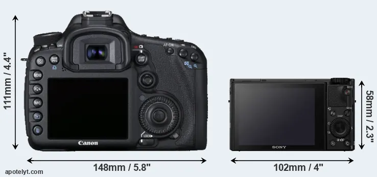The physical size and weight of the Canon 7D and the Sony RX100 IV are illustrated in the side-by-side display below. The two cameras are presented according to their relative size. Three consecutive perspectives from the front, the top, and the back are available. All width, height and depth dimensions are rounded to the nearest millimeter.