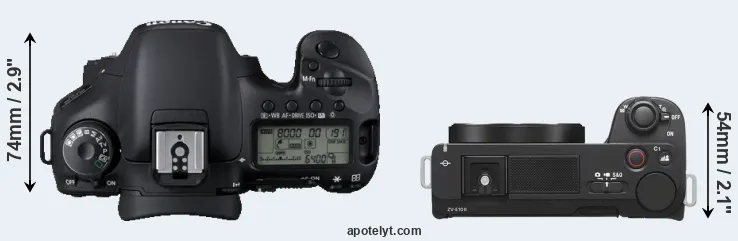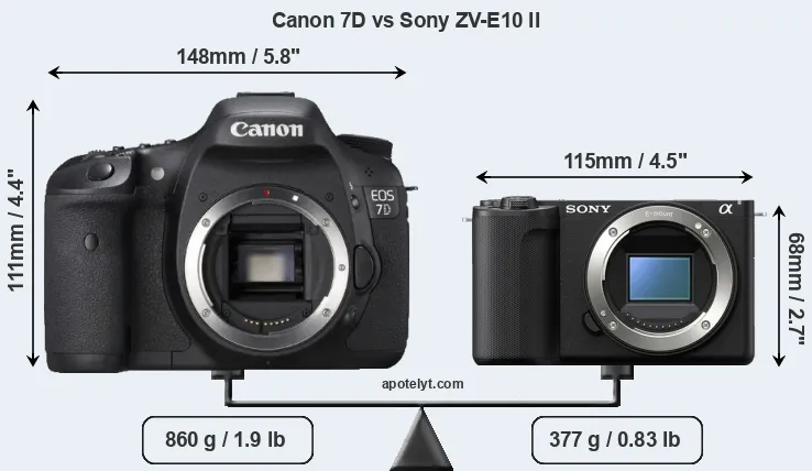 The side-by-side display below illustrates the physical size and weight of the Canon 7D and the Sony ZV-E10 II. The two cameras are presented according to their relative size. Three successive views from the front, the top, and the rear are shown. All size dimensions are rounded to the nearest millimeter.