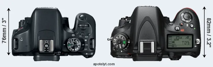 The side-by-side display below illustrates the physical size and weight of the Canon 800D and the Nikon D610. The two cameras are presented according to their relative size. Three consecutive perspectives from the front, the top, and the back are available. All width, height and depth measures are rounded to the nearest millimeter.