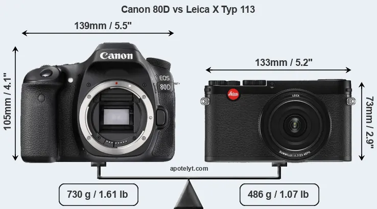 The side-by-side display below illustrates the physical size and weight of the Canon 80D and the Leica X Typ 113. The two cameras are presented according to their relative size. Three consecutive views from the front, the top, and the rear side are shown. All width, height and depth measures are rounded to the nearest millimeter.