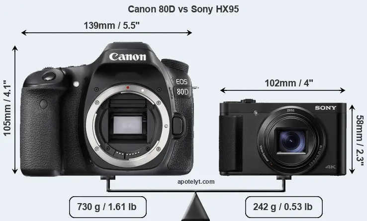 An illustration of the physical size and weight of the Canon 80D and the Sony HX95 is provided in the side-by-side display below. The two cameras are presented according to their relative size. Three consecutive views from the front, the top, and the rear side are shown. All width, height and depth measures are rounded to the nearest millimeter.