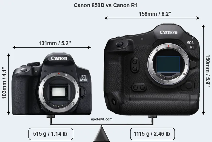 The physical size and weight of the Canon 850D and the Canon R1 are illustrated in the side-by-side display below. The two cameras are presented according to their relative size. Three consecutive views from the front, the top, and the rear side are shown. All width, height and depth dimensions are rounded to the nearest millimeter.