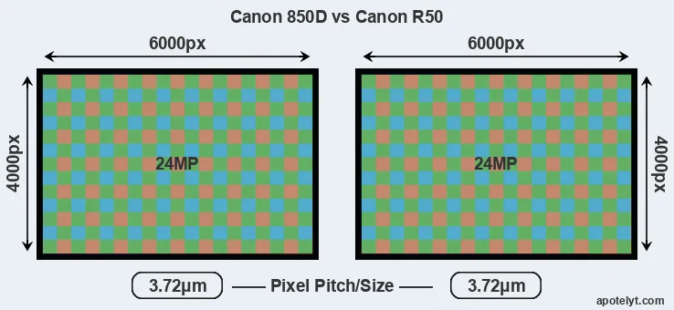 The two cameras under review do not only share the same sensor size, but also offer an identical resolution of 24 megapixels. This similarity in sensor specs implies that both the 850D and the R50 have the same pixel density, as well as the same pixel size. It should, however, be noted that the R50 is much more recent (by 2 years and 11 months) than the 850D, and its sensor will have benefitted from technological advances during this time.