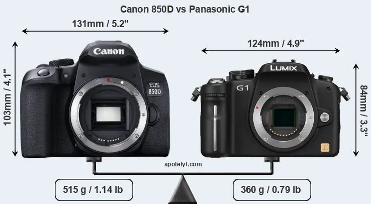 An illustration of the physical size and weight of the Canon 850D and the Panasonic G1 is provided in the side-by-side display below. The two cameras are presented according to their relative size. Three consecutive perspectives from the front, the top, and the back are available. All size dimensions are rounded to the nearest millimeter.
