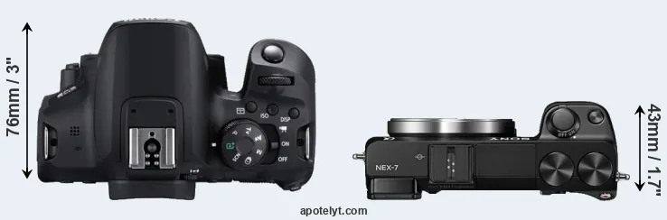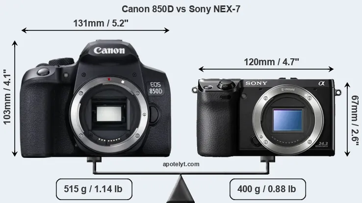 The side-by-side display below illustrates the physical size and weight of the Canon 850D and the Sony NEX-7. The two cameras are presented according to their relative size. Three consecutive perspectives from the front, the top, and the back are available. All width, height and depth dimensions are rounded to the nearest millimeter.