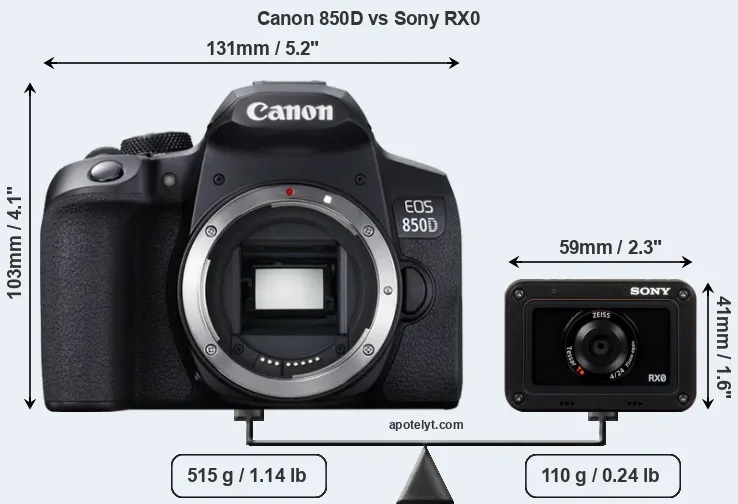 The physical size and weight of the Canon 850D and the Sony RX0 are illustrated in the side-by-side display below. The two cameras are presented according to their relative size. Three consecutive perspectives from the front, the top, and the back are available. All width, height and depth dimensions are rounded to the nearest millimeter.