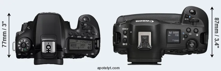 An illustration of the physical size and weight of the Canon 90D and the Canon R1 is provided in the side-by-side display below. The two cameras are presented according to their relative size. Three successive views from the front, the top, and the rear are shown. All width, height and depth dimensions are rounded to the nearest millimeter.