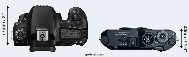 The physical size and weight of the Canon 90D and the Epson R-D1 are illustrated in the side-by-side display below. The two cameras are presented according to their relative size. Three consecutive perspectives from the front, the top, and the back are available. All width, height and depth dimensions are rounded to the nearest millimeter.