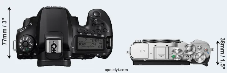 The side-by-side display below illustrates the physical size and weight of the Canon 90D and the Olympus E-P7. The two cameras are presented according to their relative size. Three consecutive views from the front, the top, and the rear side are shown. All width, height and depth dimensions are rounded to the nearest millimeter.
