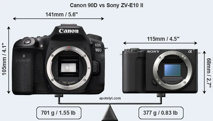 The above size and weight comparisons are to some extent incomplete since they do not consider the interchangeable lenses that both of these cameras require. Both cameras have similarly sized sensors, but DSLRs have a larger flange-to-focal plane distance than mirrorless cameras, which imposes contraints on the optical engineering process and generally leads to bigger and heavier lenses. You can compare the optics available for the two cameras in the Canon EF Lens Catalog (90D) and the Sony E-Mount Lens Catalog (ZV-E10 II). Mirrorless cameras, such as the ZV-E10 II, have moreover the advantage that they can use many lenses from other systems via adapters, as they have a relatively short flange to focal plane distance.