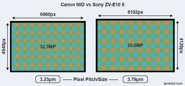 Despite having a smaller sensor, the Canon 90D offers a higher resolution of 32.3 megapixels, compared with 25.6 MP of the Sony ZV-E10 II. This megapixels advantage comes at the cost of a higher pixel density and a smaller size of the individual pixel (with a pixel pitch of 3.23μm versus 3.79μm for the ZV-E10 II). Moreover, it should be noted that the ZV-E10 II is much more recent (by 4 years and 10 months) than the 90D, and its sensor will have benefitted from technological advances during this time that further enhance the light gathering capacity of its pixel-units.