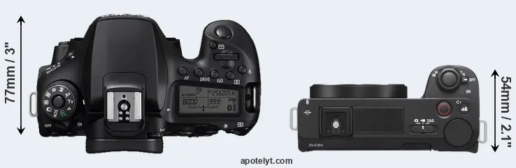 The physical size and weight of the Canon 90D and the Sony ZV-E10 II are illustrated in the side-by-side display below. The two cameras are presented according to their relative size. Three consecutive perspectives from the front, the top, and the back are available. All width, height and depth dimensions are rounded to the nearest millimeter.