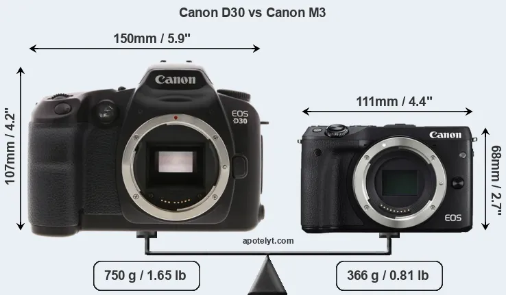 If the front view area (width x height) of the cameras is taken as an aggregate measure of their size, the Canon M3 is considerably smaller (53 percent) than the Canon D30. Moreover, the M3 is substantially lighter (51 percent) than the D30. In this context, it is worth noting that neither the D30 nor the M3 are weather-sealed.