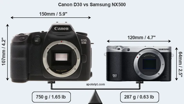 If the front view area (width x height) of the cameras is taken as an aggregate measure of their size, the Samsung NX500 is considerably smaller (52 percent) than the Canon D30. Moreover, the NX500 is substantially lighter (62 percent) than the D30. In this context, it is worth noting that neither the D30 nor the NX500 are weather-sealed.