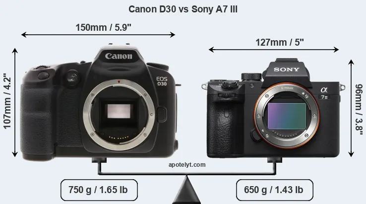 The side-by-side display below illustrates the physical size and weight of the Canon D30 and the Sony A7 III. The two cameras are presented according to their relative size. Three consecutive perspectives from the front, the top, and the back are available. All width, height and depth measures are rounded to the nearest millimeter.