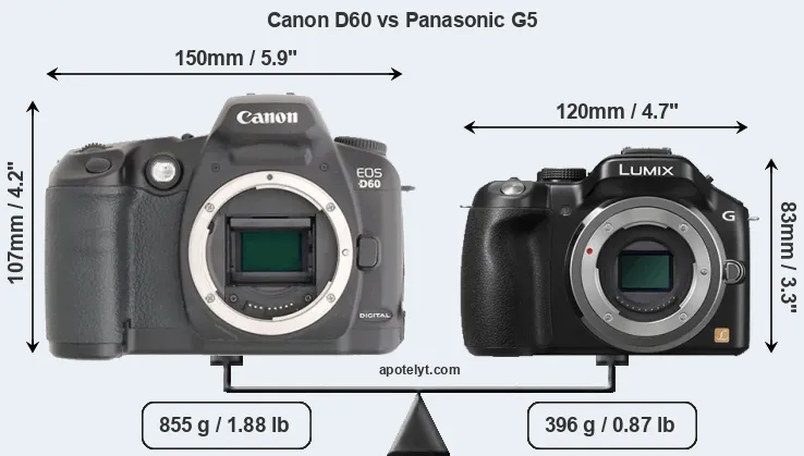 An illustration of the physical size and weight of the Canon D60 and the Panasonic G5 is provided in the side-by-side display below. The two cameras are presented according to their relative size. Three consecutive views from the front, the top, and the rear side are shown. All width, height and depth dimensions are rounded to the nearest millimeter.