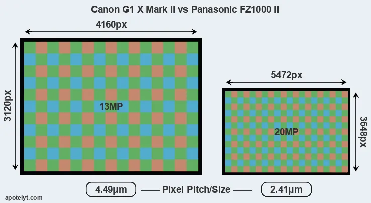 Despite having a smaller sensor, the FZ1000 II offers a higher resolution of 20 megapixels, compared with 13 MP of the G1X Mark II. This megapixels advantage comes at the cost of a higher pixel density and a smaller size of the individual pixel (with a pixel pitch of 2.41μm versus 4.49μm for the G1X Mark II). However, it should be noted that the FZ1000 II is much more recent (by 5 years) than the G1X Mark II, and its sensor will have benefitted from technological advances during this time that make it possible to gather light more efficiently.