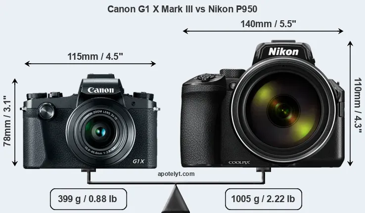If the front view area (width x height) of the cameras is taken as an aggregate measure of their size, the Nikon P950 is considerably larger (72 percent) than the Canon G1 X Mark III. Moreover, the P950 is substantially heavier (152 percent) than the G1X Mark III. It is worth mentioning in this context that the G1X Mark III is splash and dust resistant, while the P950 does not feature any corresponding weather-sealing.