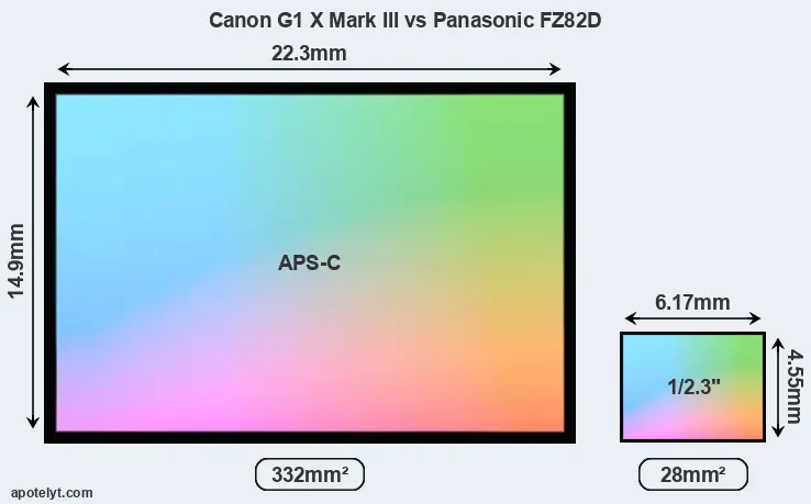 Of the two cameras under consideration, the Canon G1 X Mark III features an APS-C sensor and the Panasonic FZ82D a 1/2.3-inch sensor. The sensor area in the FZ82D is 92 percent smaller. As a result of these sensor size differences, the cameras have a format factor of, respectively, 1.5 and 5.6. The sensor in the G1X Mark III has a native 3:2 aspect ratio, while the one in the FZ82D offers a 4:3 aspect.