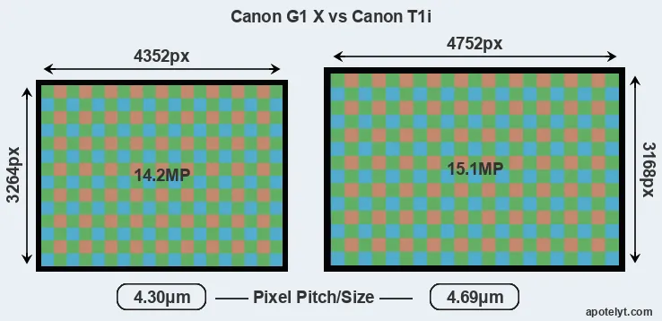 With 15.1MP, the T1i offers a higher resolution than the G1X (14.2MP), but the T1i nevertheless has larger individual pixels (pixel pitch of 4.69μm versus 4.30μm for the G1X) due to its larger sensor. However, the G1X is a much more recent model (by 2 years and 9 months) than the T1i, and its sensor will have benefitted from technological advances during this time that enhance the light gathering capacity of its pixel-units.