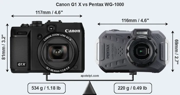 An illustration of the physical size and weight of the Canon G1 X and the Pentax WG-1000 is provided in the side-by-side display below. The two cameras are presented according to their relative size. Three consecutive views from the front, the top, and the rear side are shown. All width, height and depth measures are rounded to the nearest millimeter.