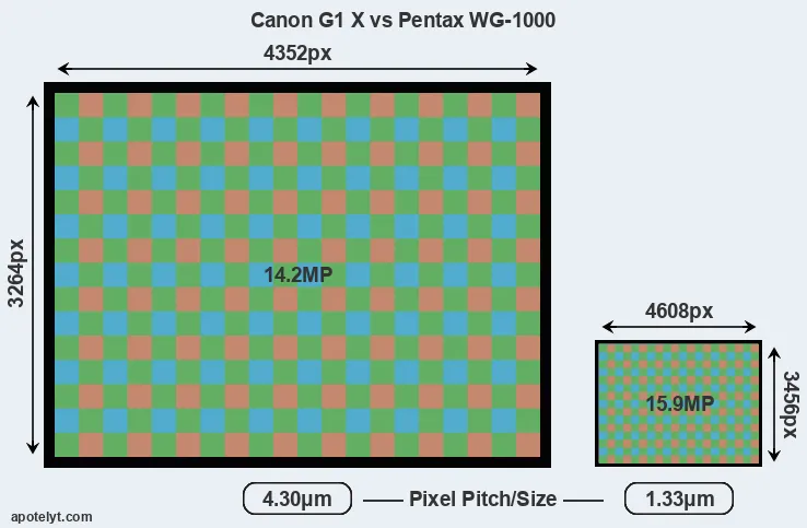 Despite having a smaller sensor, the WG-1000 offers a higher resolution of 15.9 megapixels, compared with 14.2 MP of the G1X. This megapixels advantage comes at the cost of a higher pixel density and a smaller size of the individual pixel (with a pixel pitch of 1.33μm versus 4.30μm for the G1X). However, it should be noted that the WG-1000 is much more recent (by 12 years and 4 months) than the G1X, and its sensor will have benefitted from technological advances during this time that make it possible to gather light more efficiently. Coming back to sensor resolution, it should be mentioned that the WG-1000 has no anti-alias filter installed, so that it can capture all the detail its sensor resolves.