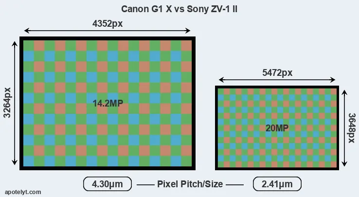 Despite having a smaller sensor, the ZV-1 II offers a higher resolution of 20 megapixels, compared with 14.2 MP of the G1X. This megapixels advantage comes at the cost of a higher pixel density and a smaller size of the individual pixel (with a pixel pitch of 2.41μm versus 4.30μm for the G1X). However, it should be noted that the ZV-1 II is much more recent (by 11 years and 4 months) than the G1X, and its sensor will have benefitted from technological advances during this time that make it possible to gather light more efficiently.