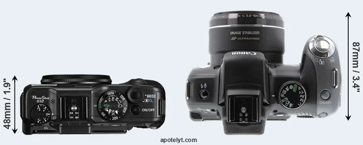The physical size and weight of the Canon G12 and the Canon SX10 are illustrated in the side-by-side display below. The two cameras are presented according to their relative size. Three successive views from the front, the top, and the rear are shown. All size dimensions are rounded to the nearest millimeter.