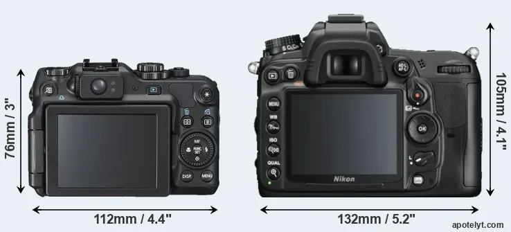 An illustration of the physical size and weight of the Canon G12 and the Nikon D7000 is provided in the side-by-side display below. The two cameras are presented according to their relative size. Three successive views from the front, the top, and the rear are shown. All width, height and depth dimensions are rounded to the nearest millimeter.