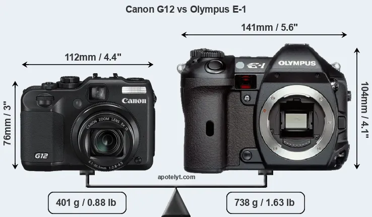 If the front view area (width x height) of the cameras is taken as an aggregate measure of their size, the Olympus E-1 is considerably larger (72 percent) than the Canon G12. It is noteworthy in this context that the E-1 is splash and dust-proof, while the G12 does not feature any corresponding weather-sealing.