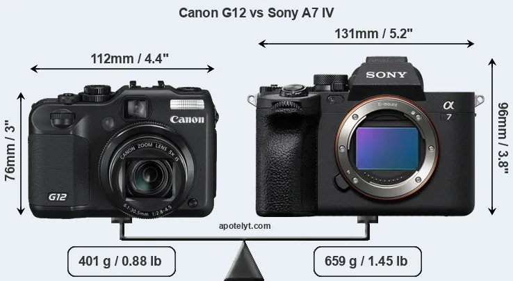 If the front view area (width x height) of the cameras is taken as an aggregate measure of their size, the Sony A7 IV is considerably larger (48 percent) than the Canon G12. It is noteworthy in this context that the A7 IV is splash and dust-proof, while the G12 does not feature any corresponding weather-sealing.