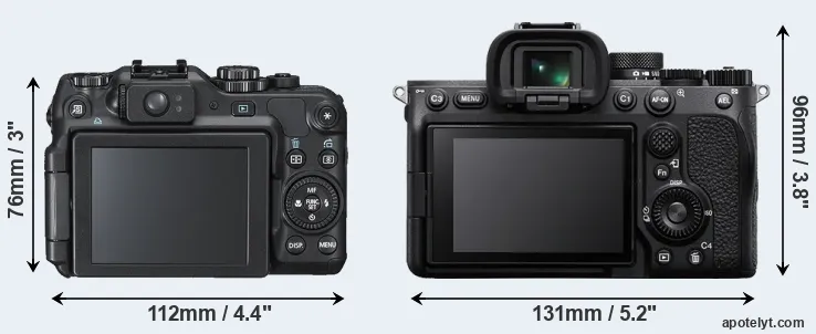 The physical size and weight of the Canon G12 and the Sony A7 IV are illustrated in the side-by-side display below. The two cameras are presented according to their relative size. Three successive views from the front, the top, and the rear are shown. All width, height and depth measures are rounded to the nearest millimeter.