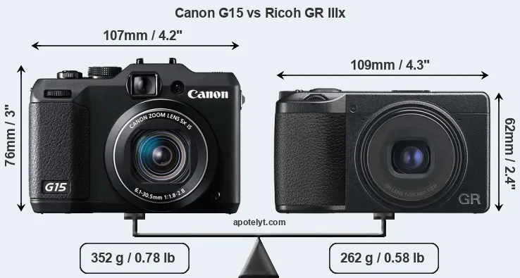If the front view area (width x height) of the cameras is taken as an aggregate measure of their size, the Ricoh GR IIIx is notably smaller (17 percent) than the Canon G15. Moreover, the GR IIIx is markedly lighter (26 percent) than the G15. In this context, it is worth noting that neither the G15 nor the GR IIIx are weather-sealed.