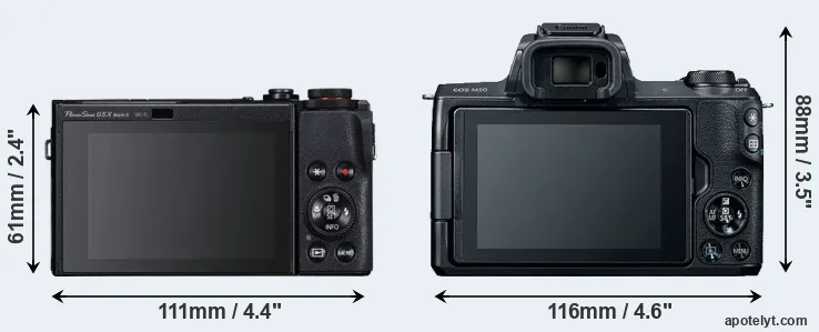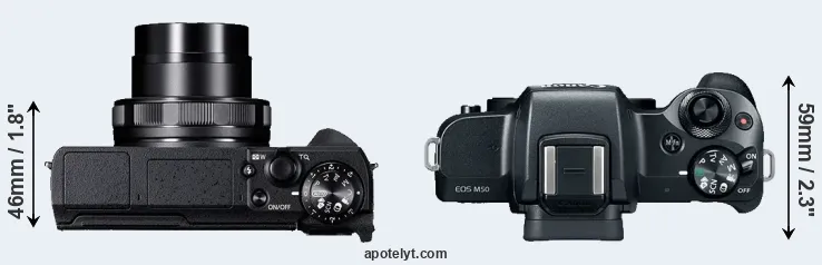 The side-by-side display below illustrates the physical size and weight of the Canon G5 X Mark II and the Canon M50. The two cameras are presented according to their relative size. Three successive views from the front, the top, and the rear are shown. All width, height and depth measures are rounded to the nearest millimeter.