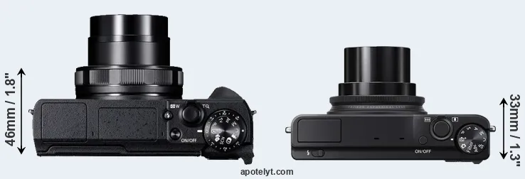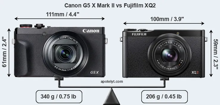 The side-by-side display below illustrates the physical size and weight of the Canon G5 X Mark II and the Fujifilm XQ2. The two cameras are presented according to their relative size. Three consecutive perspectives from the front, the top, and the back are available. All size dimensions are rounded to the nearest millimeter.
