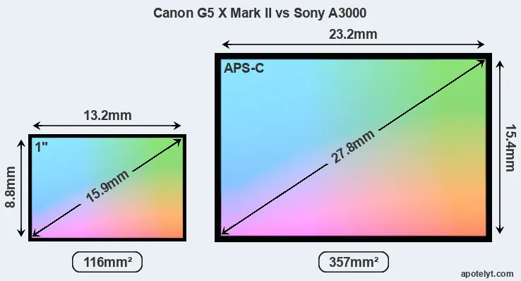 Of the two cameras under consideration, the Canon G5 X Mark II features an one-inch sensor and the Sony A3000 an APS-C sensor. The sensor area in the A3000 is 208 percent bigger. As a result of these sensor size differences, the cameras have a format factor of, respectively, 2.7 and 1.5. Both cameras have a native aspect ratio (sensor width to sensor height) of 3:2.