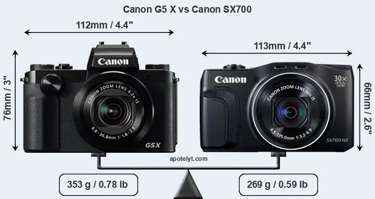 An illustration of the physical size and weight of the Canon G5 X and the Canon SX700 is provided in the side-by-side display below. The two cameras are presented according to their relative size. Three consecutive perspectives from the front, the top, and the back are available. All width, height and depth dimensions are rounded to the nearest millimeter.