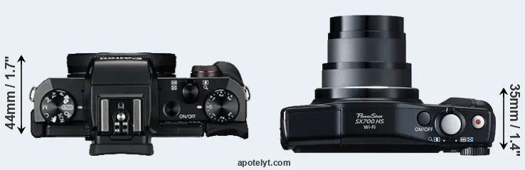 If the front view area (width x height) of the cameras is taken as an aggregate measure of their size, the Canon SX700 is notably smaller (12 percent) than the Canon G5 X. Moreover, the SX700 is markedly lighter (24 percent) than the G5X. In this context, it is worth noting that neither the G5X nor the SX700 are weather-sealed.