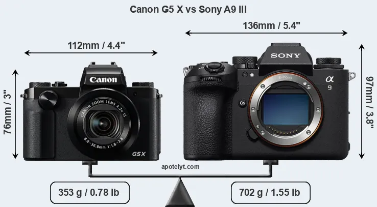 An illustration of the physical size and weight of the Canon G5 X and the Sony A9 III is provided in the side-by-side display below. The two cameras are presented according to their relative size. Three consecutive perspectives from the front, the top, and the back are available. All width, height and depth dimensions are rounded to the nearest millimeter.