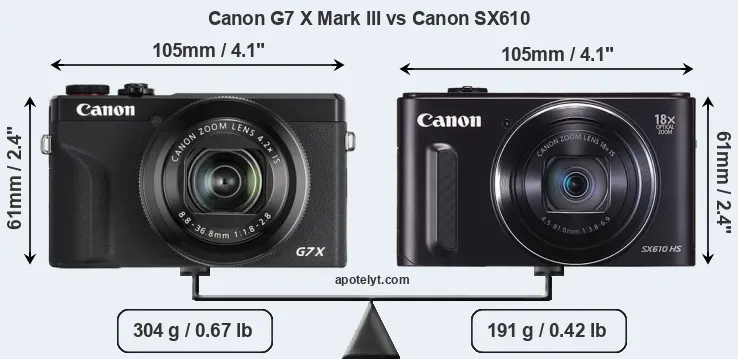 In this particular case, the Canon G7 X Mark III and the Canon SX610 have exactly the same width and height, and, thus, have identically-sized bodies. However, the SX610 is substantially lighter (37 percent) than the G7X Mark III. In this context, it is worth noting that neither the G7X Mark III nor the SX610 are weather-sealed.