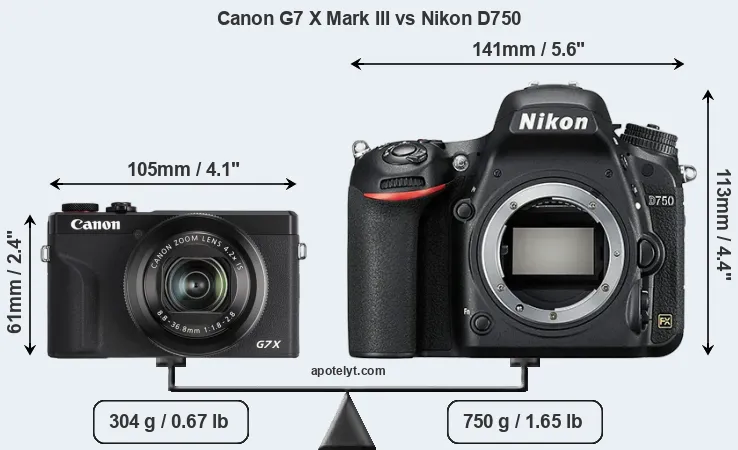 The side-by-side display below illustrates the physical size and weight of the Canon G7 X Mark III and the Nikon D750. The two cameras are presented according to their relative size. Three consecutive perspectives from the front, the top, and the back are available. All width, height and depth dimensions are rounded to the nearest millimeter.