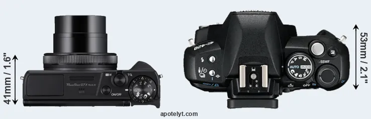 The side-by-side display below illustrates the physical size and weight of the Canon G7 X Mark III and the Olympus E-420. The two cameras are presented according to their relative size. Three consecutive perspectives from the front, the top, and the back are available. All size dimensions are rounded to the nearest millimeter.